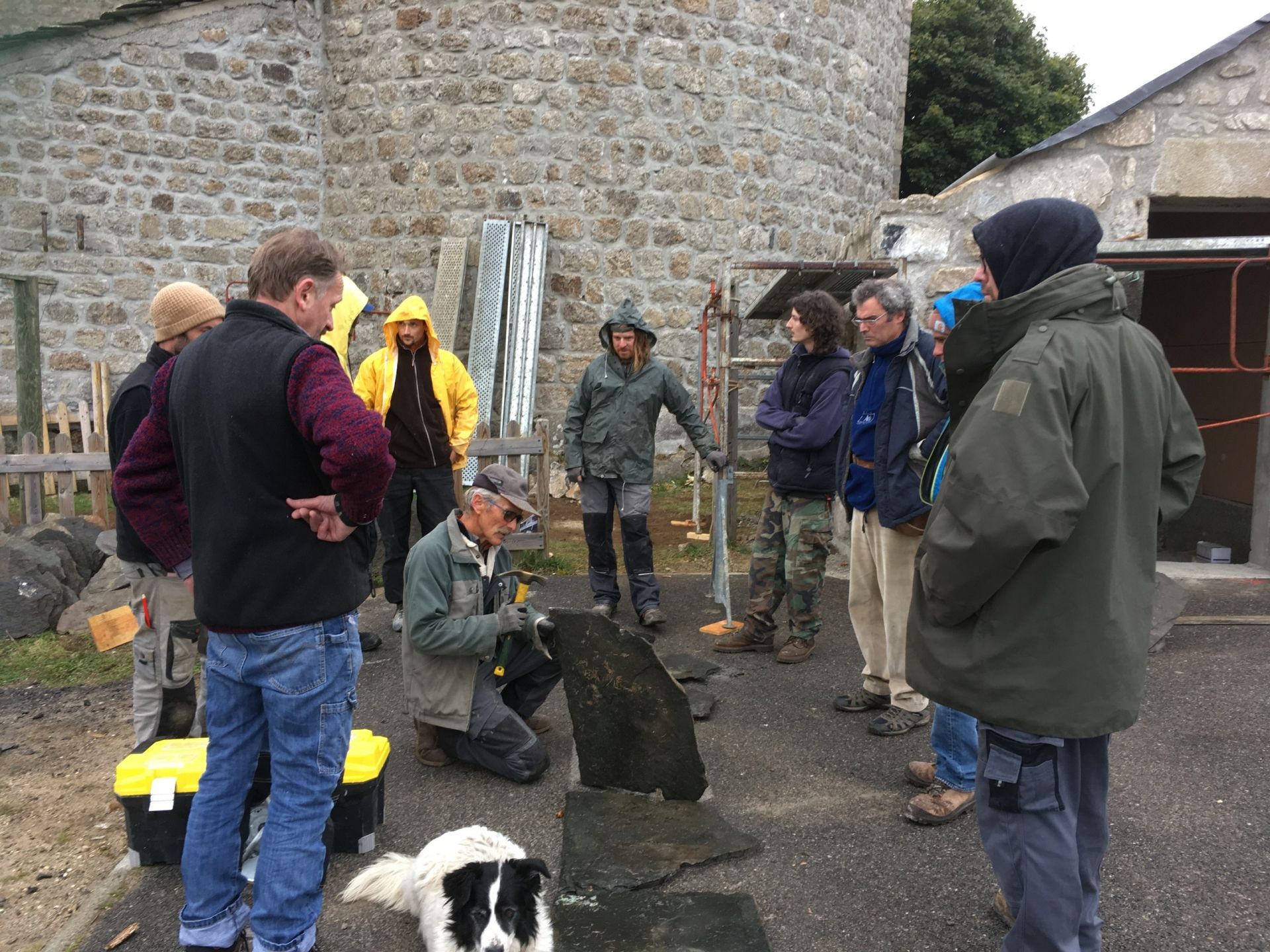 Une fois le bâti réalisé par une société locale ainsi que la charpente posée, nos stagiaires, essentiellement des professionnels, pouvaient s'initier à la taille et pose de lauze encadrés par Jean-François Marion, maitre-lauzeur en activité et Florian Jarlut, maçon en bâti ancien.
